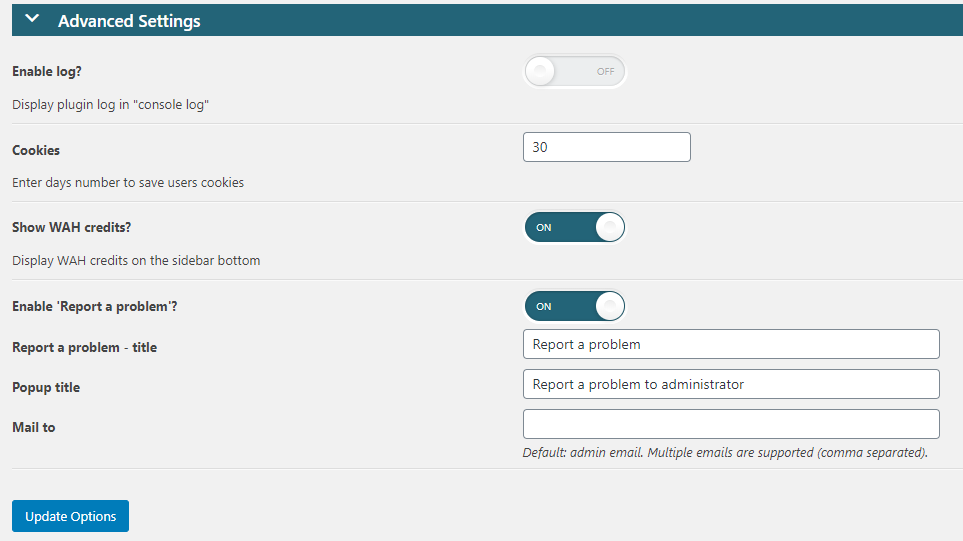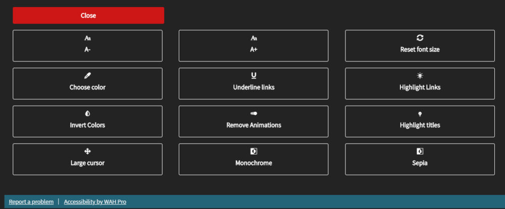 Now you can enable “Report a problem” module and display WAH credits in the bottom of the accessibility sidebar: